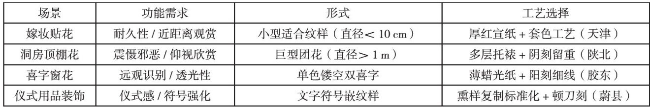 中国民间婚俗剪纸是中华传统视觉文化的重要载体,其以鲜明的装饰性深度介入婚庆仪式空间,通过象征性纹样营造喜庆氛围、传递吉祥寓意,成为民俗生活与审美实践的重要纽带。当前学界对其研究多聚焦文化符号的隐喻解析(如婚育观念、祈福心理),或置于非物质文化遗产保护框架下探讨传承路径,而对支撑其装饰功能的本体性要素一形式语言构成规律与制作工艺技术体系,缺乏系统性专研。 本文以“形色意匠”为核心视角,聚焦婚俗剪纸