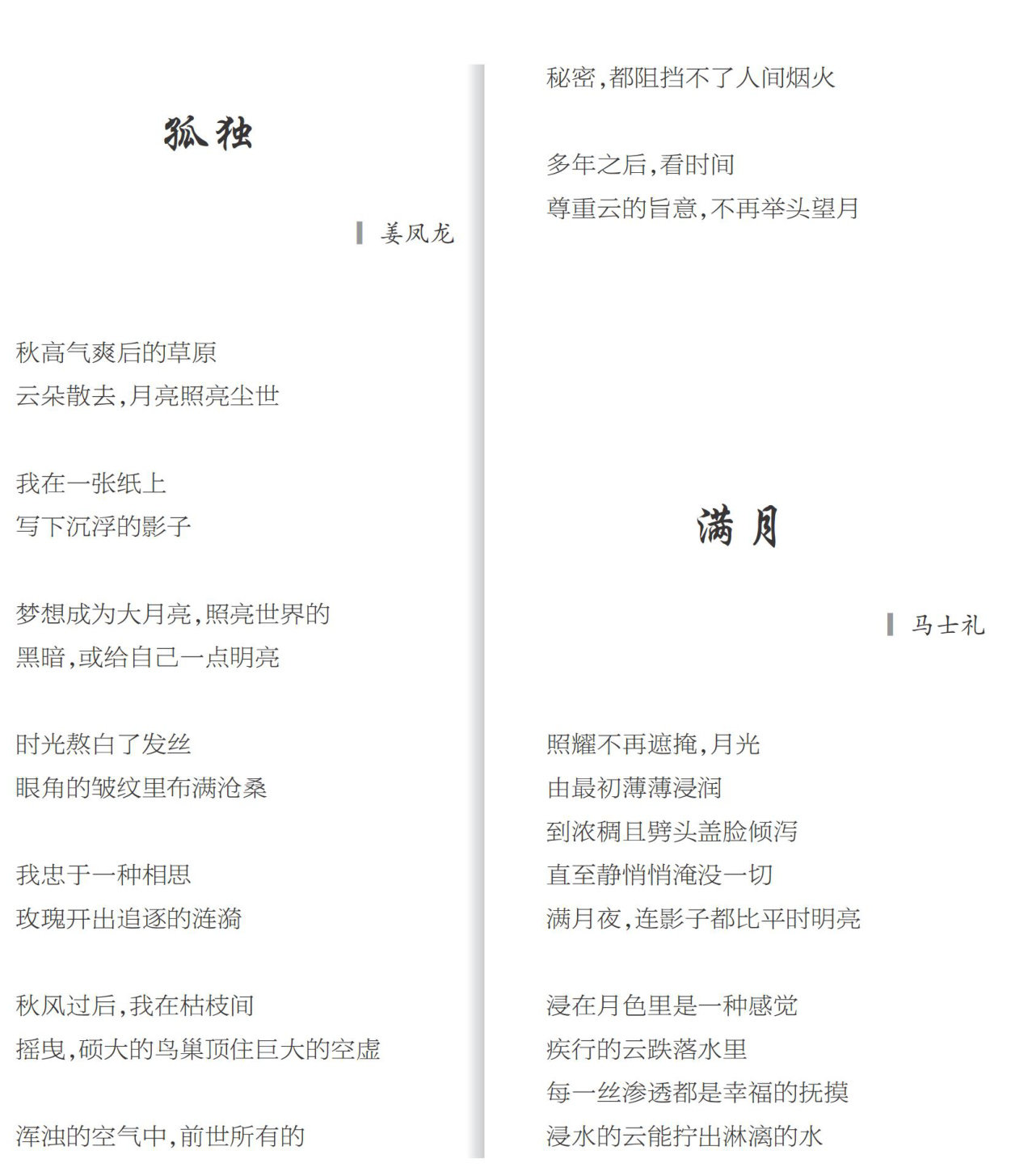 孤独 姜凤龙 秋高气爽后的草原 云朵散去,月亮照亮尘世 我在一张纸上 写下沉浮的影子 梦想成为大月亮,照亮世界的 黑暗,或给自己一点明亮 时光熬白了发丝 眼角的皱纹里布满沧桑 我忠于一种相思 玫瑰开出追逐的涟漪 秋风过后,我在枯枝间 摇曳,硕大的鸟巢顶住巨大的空虚 浑浊的空气中,前世所有的 秘密,都阻挡不了人间烟火 多年之后,看时间 尊重云的旨意,不再举头望月