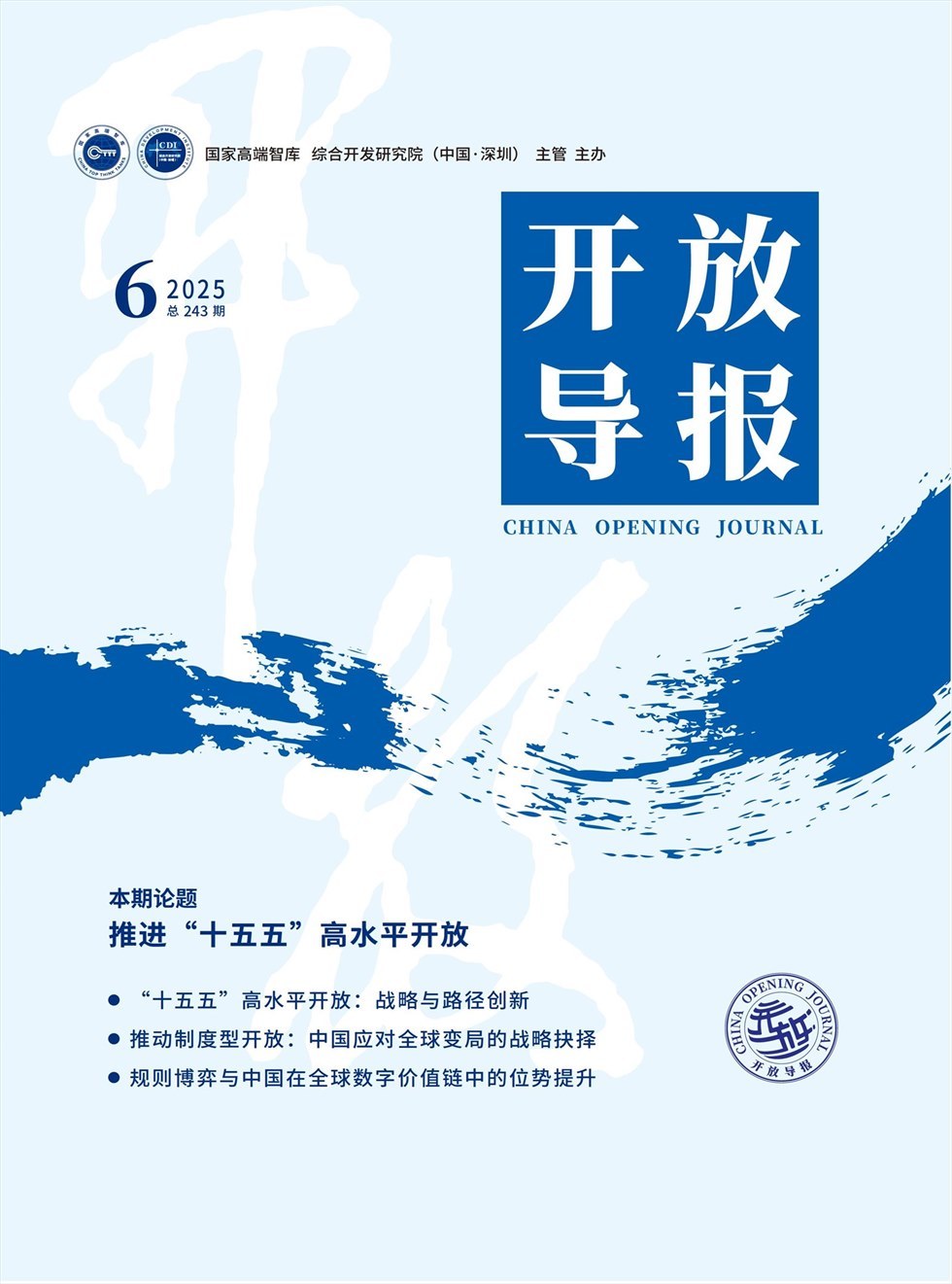 《开放导报》综合开发研究(中国·深圳)主办,宗旨:向世界展示中国,向中国介绍世界,聚集我国改革开放中的热点问题、前沿问题以及世界经济发展趋势,去研究新问题,发表新观点,开拓新思路,发挥正确的导向作用。