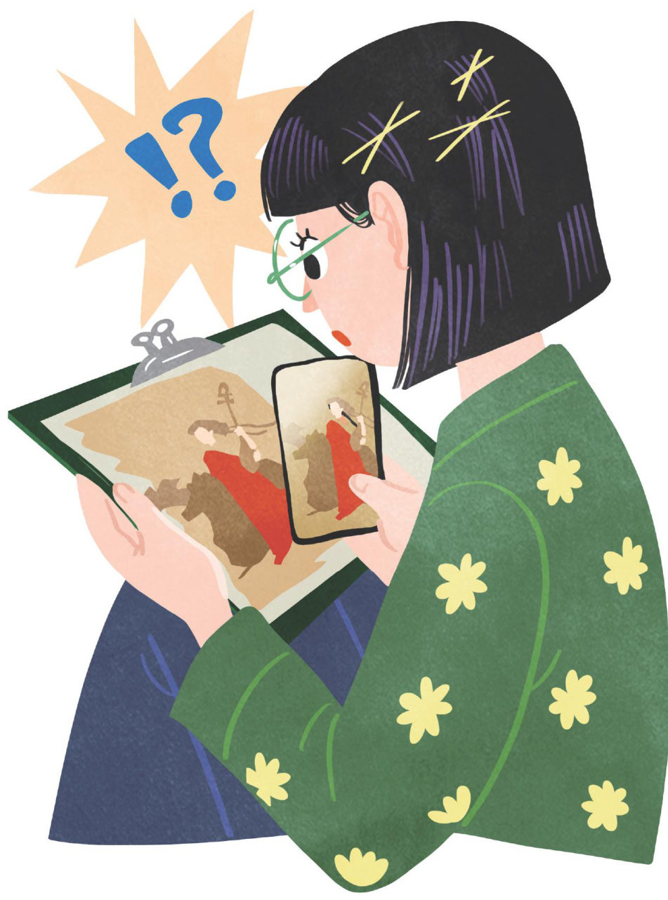 1 下午四五点,省博物馆的古画展馆里,只有零零星星的游览者。在展馆一个不起眼的角落,挂着一幅《昭君出塞图》。画面中,身着胡服的王昭君手牵缰绳骑于黑马之上,凝目远眺,神思缥缈;四五只南飞的大雁在昭君头上,正列队飞向远处青黛色的树梢。画的左上角是用行书题的七言绝句:“罗裙出塞休胡马,孤雁长悲漠北风。失意谄諛天子恨,那堪幽怨画魂中。 这幅画前有两个女孩子。穿灰色短袖T恤、军绿色工装裤的短发女生坐在小