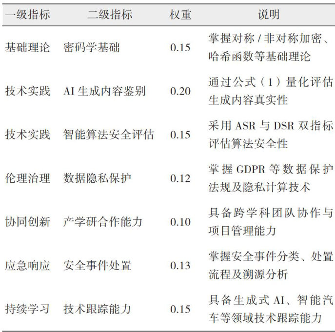 【摘要】本研究聚焦2025年生成式AI与智能网联汽车深度融合背景下的网络安全人才培养需求,构建“需求分析-能力建模-路径设计-效果评估”四维培养框架。通过德尔菲法、层次分析法及实证研究,提出包含7个一级指标、23个二级指标的能力模型,设计基础理论-技术实践-伦理治理三级课程体系,并开发基于生成对抗网络(Generative AdversarialNetwork,GAN)的智能攻防模拟平台。实证研究表明,新培养路径可使学员在AI辅助下的威胁识别速度提升 40% ,误报率降低 25% ,在车路云协同场景中的攻防对抗能力提升 16% 。本研究创新提出双导师制 + 项目孵化实践教学模式,为缓解智能网联汽车网络安全人才缺口提供理论支撑与实践参考,对提升中国智能汽车网络安全防护能力具有重要意义。