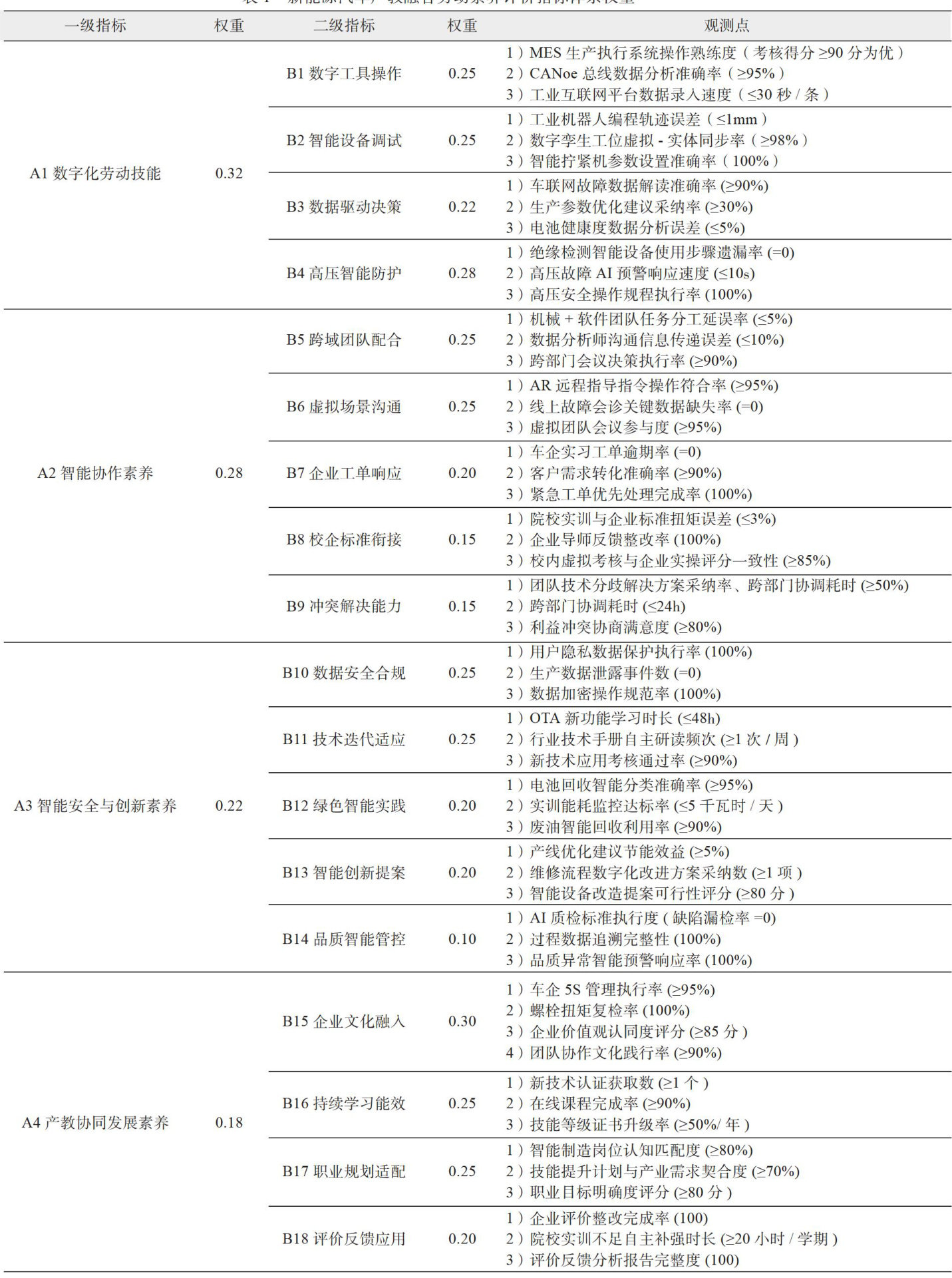 【摘要】产教融合已成为新能源汽车产业人才培养的核心路径。劳动素养评价作为品质“指挥棒”,其科学性直接决定人才培养的精准度。当前该领域评价存在指标滞后、量化不足、协同机制缺失等问题。本文通过文献研究、产业调研、德尔菲法构建产教融合劳动素养评价指标体系,运用层次分析法确定权重并开展实证检验。结果显示,该体系信度和效度良好,可为产教融合劳动素养评价提供标准化工具,推动人才培养与产业需求动态适配。