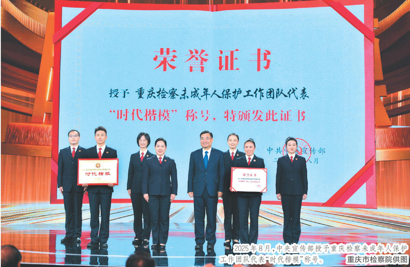 日前,渝检护“未”团队代表获评“时代楷模”。中央宣传部在授予“时代楷模”称号的决定中指出,渝检护“未”团队代表是德法相伴、倾情守护未成年人健康成长的典范,他们的先进事迹集中展示了新时代人民检察官强化法律监督、维护公平正义的精神风貌,有力彰显了共产党员牢记初心使命、矢志造福人民的政治本色。 这支团队,用持续多年的守护行动,彰显了法治的温度和力度,以人性的光辉照亮了法律的威严 荣誉与责任并行而生、相
