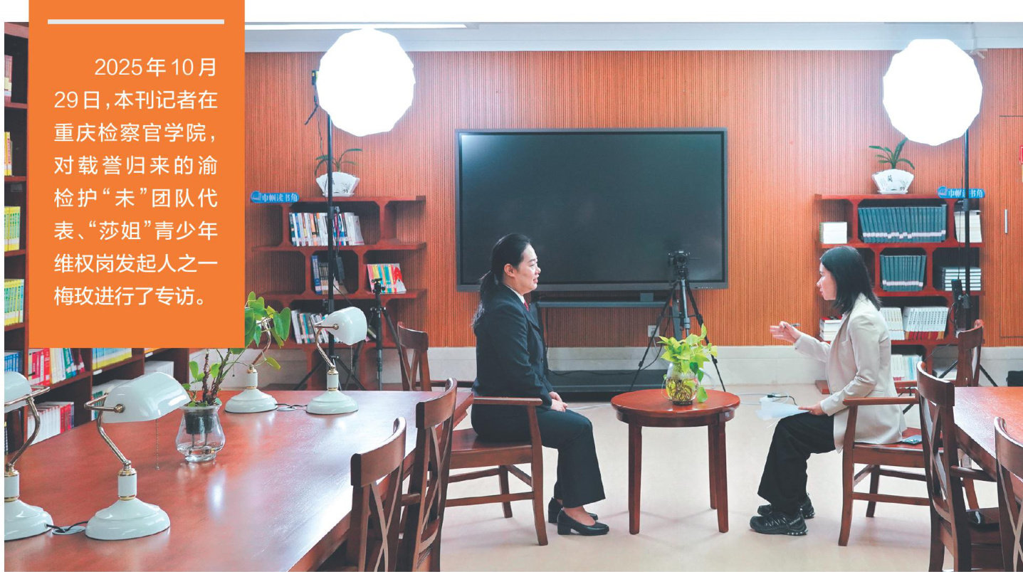 2025年10月29日,本刊记者专访渝检护“未”团队代表梅玫。记者李秀杰摄 荣誉的背后是社会责任 记者:祝贺渝检护“未”团队代表获得“时代楷模”称号,当您作为团队代表中的一员,走进中央电视台“时代楷模”发布厅时,有什么感受,您如何看待这份荣誉? 梅玫:荣誉对我们肯定是一种鼓励,但更多的其实是一种压力和鞭策。获得了荣誉,就必须承担得起它背后给予的社会责任、价值担当。作为时代楷模的一分子,我