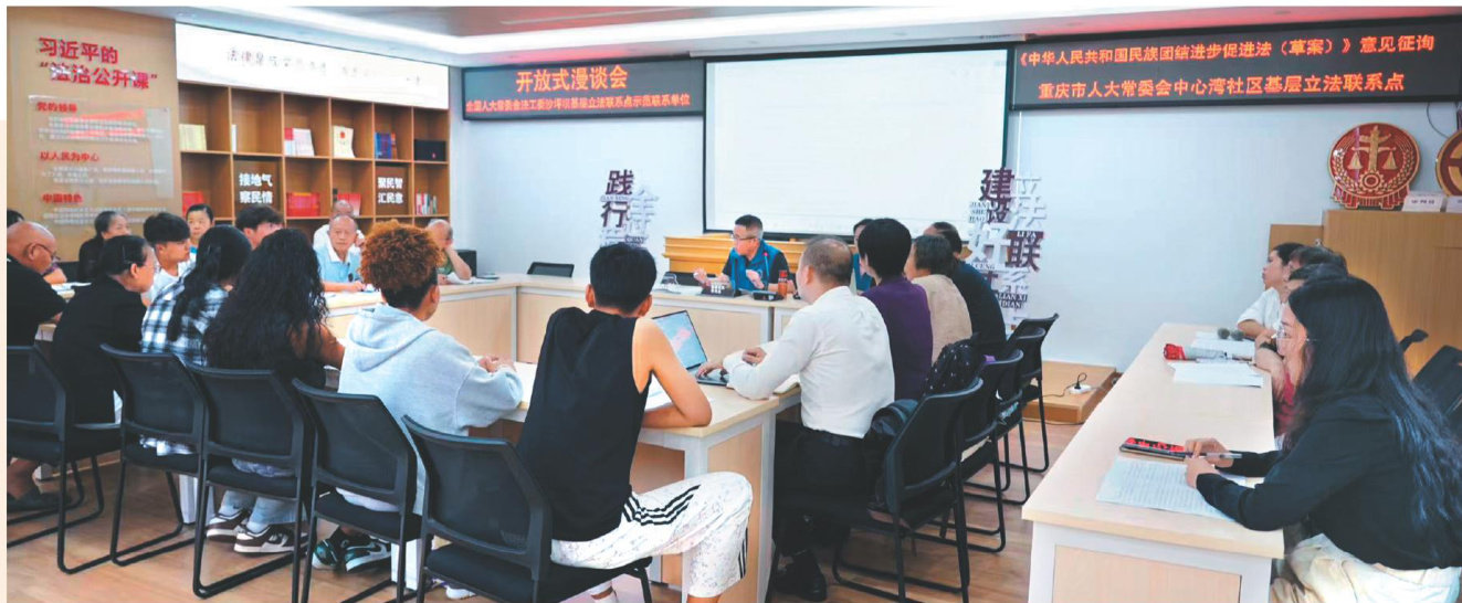 2025年9月15日,举行开放式漫谈会,倾听边疆学子心声。 沙坪坝基层立法联系点供图 法律是治国之重器,而民意是立法之根基。今年,在《中华人民共和国民族团结进步促进法(草案)》(以下简称草案)立法征询过程中,全国人大常委会法工委沙坪坝基层立法联系点从“广度、效率、深度”三个维度“破题”,跨越地域与层级界限,让边疆学子的心声、少数民族聚居地群众的智慧、基层百姓的期盼融入国家立法,既为民族团结进