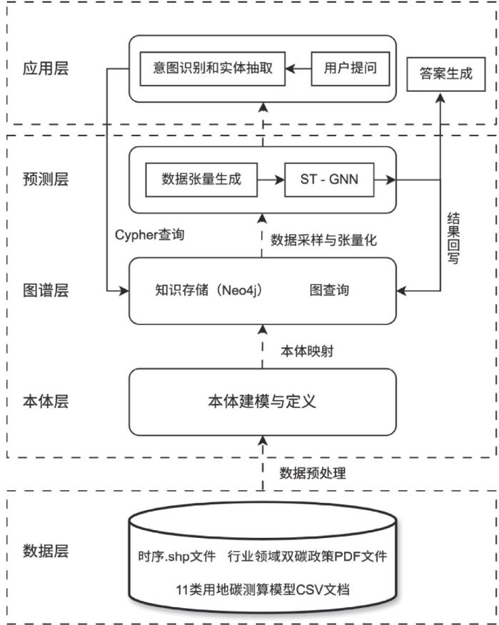 摘要:针对市域碳排放数据来源分散、方法体系零散的问题,文章构建了一套结合知识图谱与时空图神经网络(Spatio-Temporal Graph Neural Network,ST-GNN)的智能问答系统,用于双碳数据管理、时序预测与决策支持。该系统通过以市域“地块”为基本单元构建的双碳知识图谱,图谱涵盖地理空间数据、碳排放碳汇估算数据、政策文本与不同用地碳测算模型等多源数据,同时引入ST-GNN模型预测地块及特定用地的碳排放趋势,进而通过BERT-CNN意图分类与CRF模型驱动的问答引擎,实现了对图谱知识的自然语言查询。实验表明,本系统可有效整合双碳领域知识并实现碳数据的精准预测,也为用户提供了便捷高效的智能化决策支持。