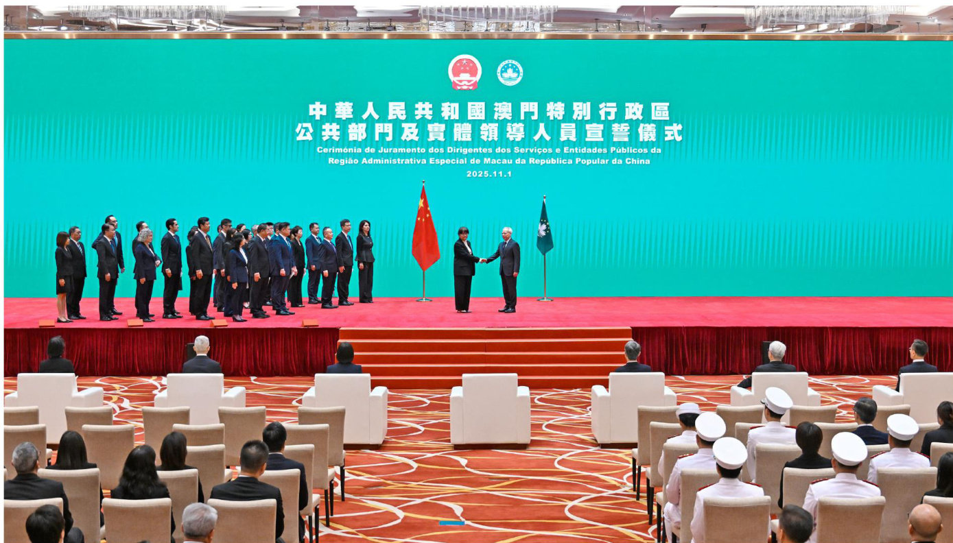 行政長官岑浩輝與宣誓的行政長官辦公室主任、私人助理、辦公室顧問及行政長官轄下部門領導合影。 澳門特別行政區政府11月1日舉行中華人民共和國澳門特別行政區公共部門及實體領導人員宣誓儀式。在監誓人見證下,264名參與宣誓儀式的領導及等同人員,鄭重聲明,必當擁護並執行《中華人民共和國澳門特別行政區基本法》,效忠中華人民共和國澳門特別行政區,盡忠職守,遵守法律,廉潔奉公,竭誠為澳門特別行政區服務。