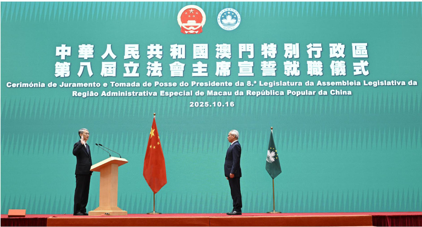 行政長官岑浩輝10月16日上午和下午先後主持了澳門特別行政區第八屆立法會全體議員,以及立法會主席的宣誓就職儀式。 全體議員的宣誓就職儀式上午11時在中國與葡語國家商貿合作服務平台綜合體舉行,在行政長官監誓下,33名第八屆立法會議員一起宣讀《就職宣誓法》規定的誓詞,在觀禮嘉賓現場見證下宣誓就職。 第八屆立法會下午3時舉行首次全體會議,由全體議員投票選出新任立法會主席。最終,張永春以全票當選澳