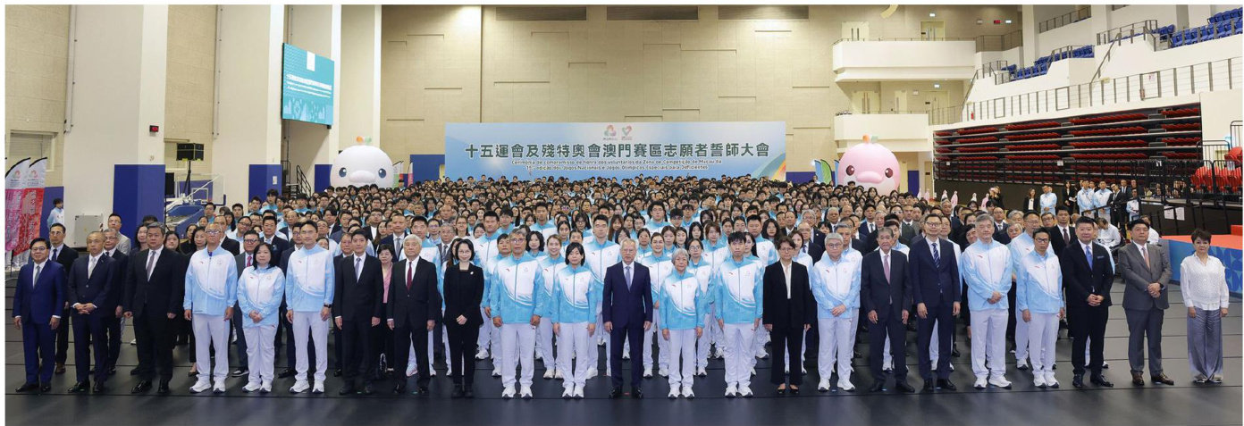 行政長官岑浩輝與澳門賽區全體志願者合影(澳門新聞局圖片) 文:少楓 圖:澳門志願者總會、澳門新聞局 第十五屆全國運動會和全國第十二屆殘疾人運動會暨第九屆特殊奥林匹克運動會(下稱“十五運會及殘特奥會")於本年十一月及十二月在廣東、香港、澳門三地聯合舉辦,這是全運會史上首次由三地聯合舉辦,澳門首次參與承辦全運會,對本地體育事業和社會經濟發展具有深遠意義。 “十五運會及殘特奥會”是三地合