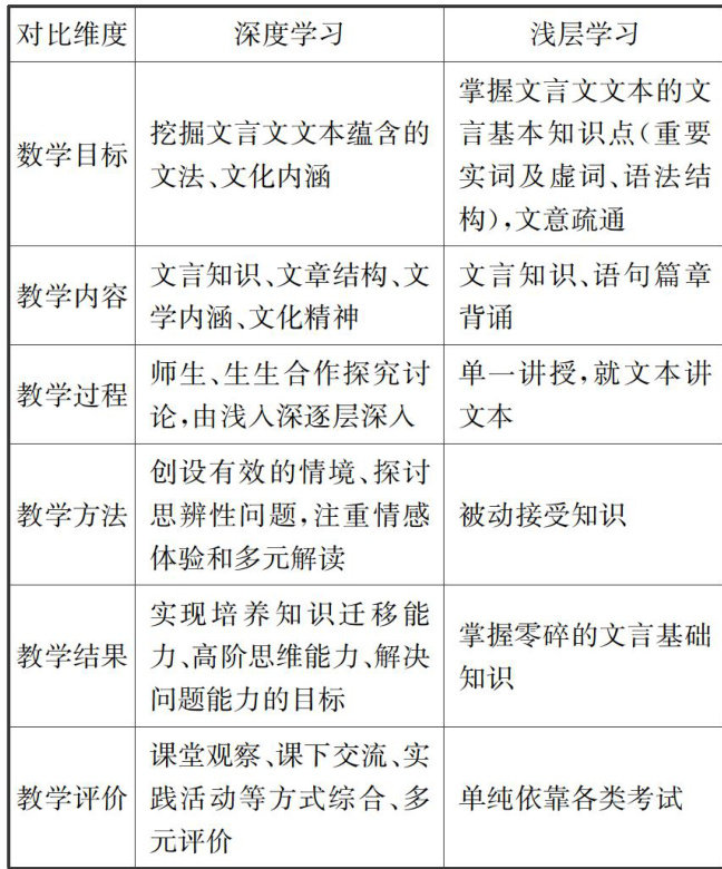 摘要:本文通过梳理统编版高中文言文选文情况,明确文言文教学在高中语文教学中占据着举足轻重的地位。本文借助于问卷调查,总结了当下文言文教学存在的问题——教学方式单一、评价方式陈旧、学习思维固化。在提炼概括深度学习理论内涵的基础上,以《赤壁赋》的两种教学设计创新点为例,探索基于深度学习理论的文言文教学策略,并得出几点反思——“言"为“文”基,文言知识前置学习;诵读有法,情感投入真诚体验;情境创设,真实有效快速沉浸;单篇群文,多重维度深挖文本;读写结合,有力推动创造生发。