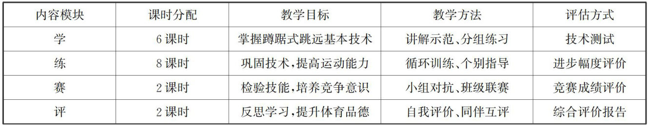 摘要:本文旨在探讨新课标下中学蹲踞式跳远教学的改革与创新,通过构建“学练赛评”一体化单元设计模式,以任务为引领,促进学生运动能力、健康行为和体育品德的发展。文章首先分析了新课标下中学蹲踞式跳远教学的具体要求,然后详细阐述了“学练赛评”一体化单元设计的内容结构与教学方案,并提出了实施建议,该模式能有效提升学生的跳远技能,激发学习兴趣,培养学生良好的体育品德。