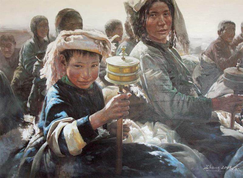 在当代油画的多元探索中,张洪的作品为“写实表现主义”提供了生动诠释。这一路径以其独特的姿态,在写实功底筑牢的具象根基之上,注入表现主义的情感张力,架起现实与心灵的桥梁。 正如艺术史中写实与表现的交织传承,张洪以笔为媒、以色为语,游走于精准与表现之间。他凭借扎实的写实技巧勾勒人物形态——从手持转经筒孩童的纯真面庞,到摩托车上一家三口的生动姿态,人物轮廓、服饰褶皱等细节皆忠实地呈现了现实模样。然而,