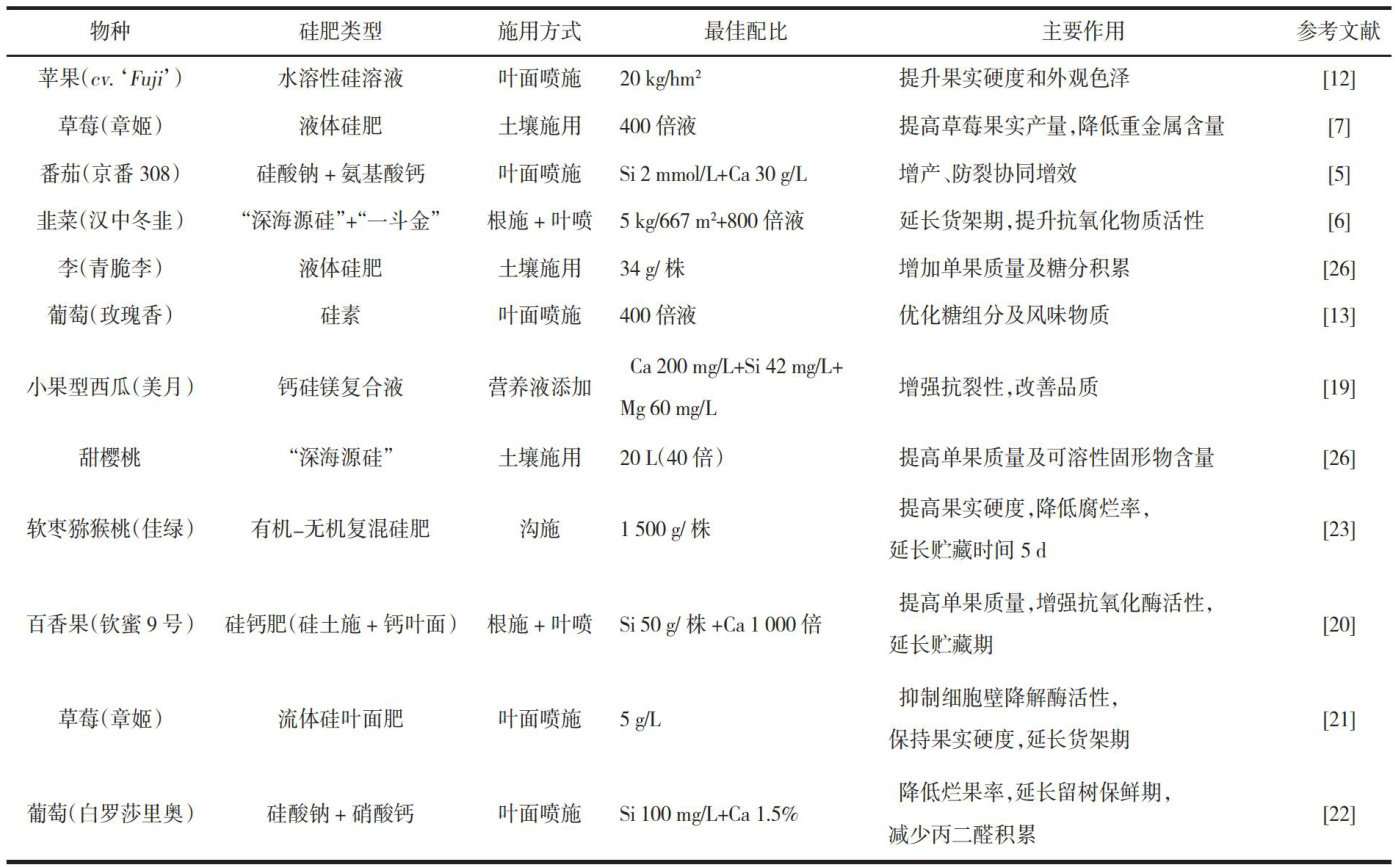摘要;硅在植物生长发育及抵御胁迫中发挥重要作用,被视为有益元素,而当前对硅吸收效率较低的果蔬品种的关注相对不足。鉴于此,本文系统梳理了近年来硅在改善果蔬发育、营养品质、风味特性、抗逆性及货架期等方面的研究进展。通过分析发现,目前该领域的研究存在作用机制不明确、系统性农艺方案缺失、新型硅源材料研发亟待加强等问题;对未来研究方向进行了展望,提出应深入揭示其分子作用机制,建立定制化的施用策略与评价体系,评估外源硅的长期生态效应,以期为拓展硅元素在果蔬领域的机理研究和实践应用提供参考。