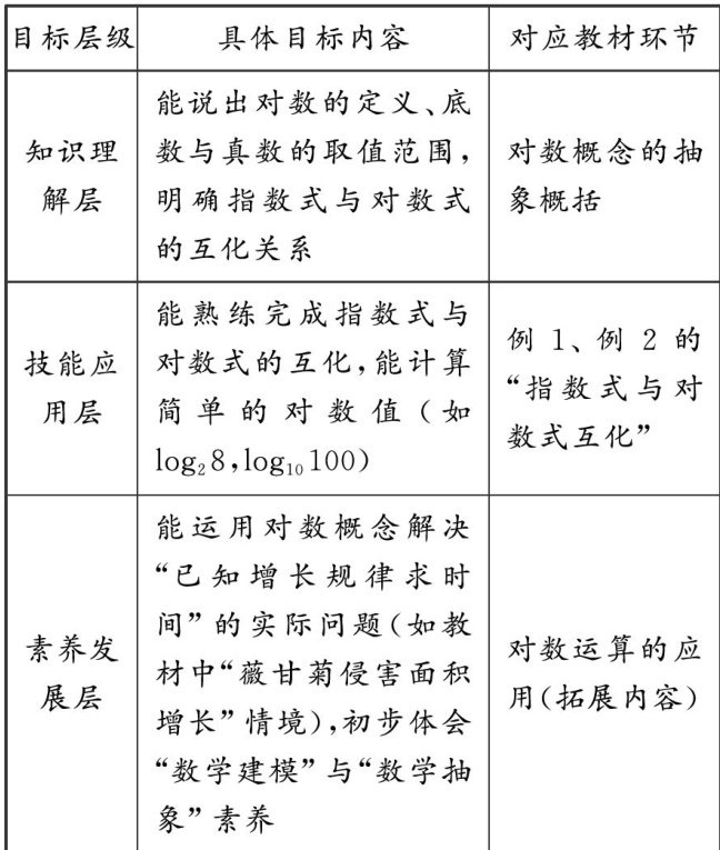 【摘要】“教一学—评”一致性是落实核心素养导向教学的关键环节,其本质是围绕“理解”构建教学目标、学习活动与评价体系的闭环.本文以高中数学北师大版必修第一册“对数的概念”为载体,先通过教材解析明确三大核心目标,即理解对数与指数的逆运算关系、掌握对数的定义及表示方法、运用对数概念解决简单问题;再据此设计“情境感知一抽象概括—迁移应用”三阶学习活动;同时配套开发课堂观察、随堂检测、任务表现等多元评价工具,最终形成“目标引领教学实施、评价深化学习理解”的教学模式.