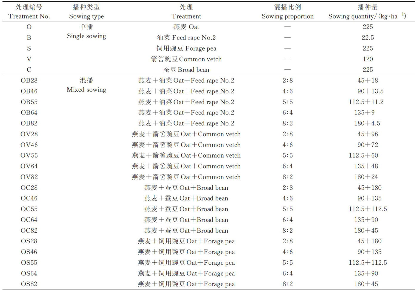 摘要:为探讨高寒区燕麦(Auena satiua)混播系统生产力与营养品质的协同提升效应,本研究选用4种优质饲草(‘兰箭3号'箭筈豌豆(Vicia sativa)、青海l3号'蚕豆(Vicia faba)、青建1号'饲用豌豆(Pisum satium)、饲油2号'油菜(Brassicanapus))与‘青引1号'燕麦按5种比例 (2:8,4:6,5:5,6:4,8:2) 混播,测定地上生物量及营养成分,计算土地当量比、相对产量和竞争比,并采用TOPSIS模型对混播效应进行综合评价。结果表明:不同混播组合在产量、品质及种间关系方面差异显著。燕麦与饲用豌豆4:6混播时干草产量最高( 10368.73kg?ha-1Ω ,且粗蛋白产量和土地当量比也显著高于燕麦单播;燕麦与箭筈豌豆8:2混播时干草产量次之 (9432.63kg?ha-1) 。在竞争性方面,燕麦与蚕豆或箭筈豌豆2:8混播组合表现出较高的相对产量和竞争优势。单播蚕豆和豌豆的粗蛋白含量较高,单播油菜的粗脂肪含量较高。燕麦与其他饲草混播时降低了饲草的粗纤维含量,提升了饲喂价值。结构方程模型显示,混播比例对产量、营养成分、饲喂价值及竞争关系均具有直接正向作用,并通过调控营养与竞争关系间接促进产量提升。TOPSIS综合评价表明,燕麦与饲用豌豆4:6混播组合在产量与品质方面兼具优势,是高寒区优选的饲草混播模式。