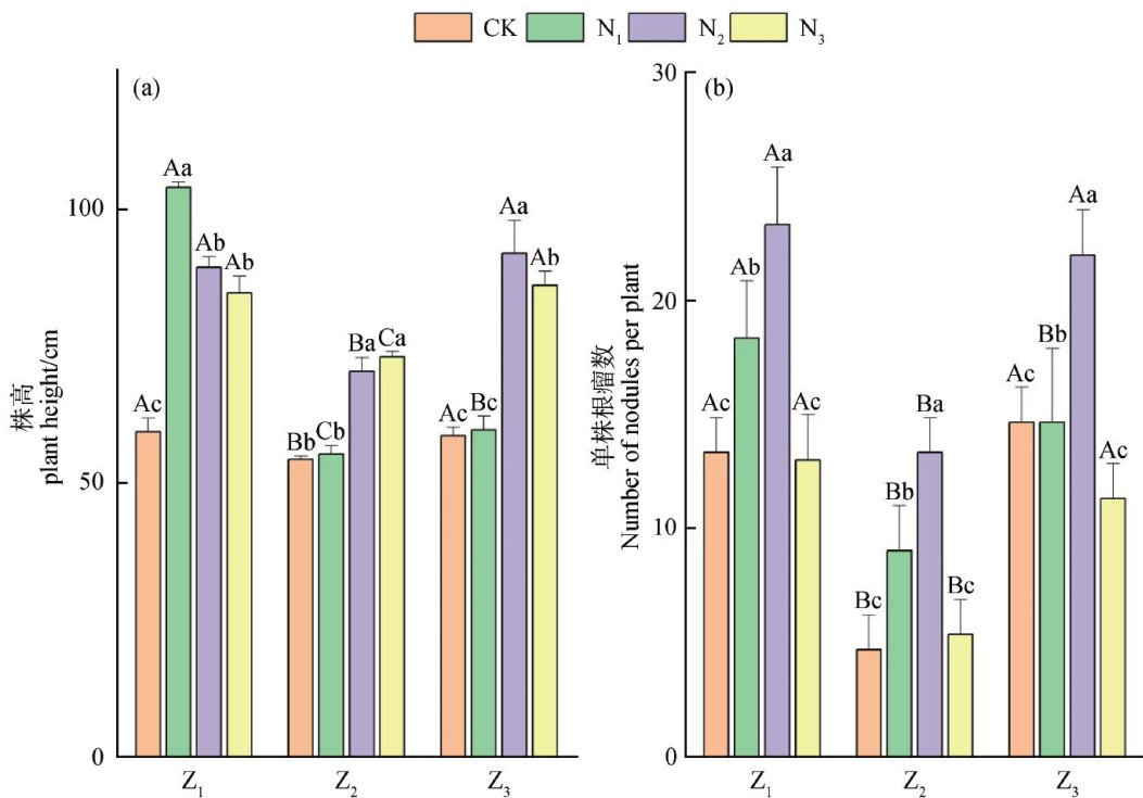 摘要:为研究在不同氮素水平下接种大豆根瘤菌对杂交饲用大豆(Glycine soja Sieb.et Zucc)生长和生理的影响,以‘蒙农S006饲用大豆'(Glycine soja Sieb.et Zucc cv.HybridF-SO06),简称SOO6,为试验材料,采用蛭石种植,设置4个氮素水平 CK(0g?kg-1) ,N1(0.714g?kg-1),N2(1.428g?kg-1),N3(2.142g?kg-1) ,分别接种3株分离自试验地种植小区中SO06根部根瘤的根瘤菌命名为 (Z1,Z2,Z3) ,研究在不同氮素水平下接种根瘤菌对S006株高、根瘤、叶长、叶宽、生物量、光合指标、可溶性糖含量、过氧化氢酶含量等指标的影响。接种根瘤菌后30d后,对SO06生长指标和生理指标进行测定。结果显示,在施用氮素为 N2 水平下,能显著增加SO06的光合作用和生物量,且在根瘤菌Z1 的处理下,对生理的影响较为显著。