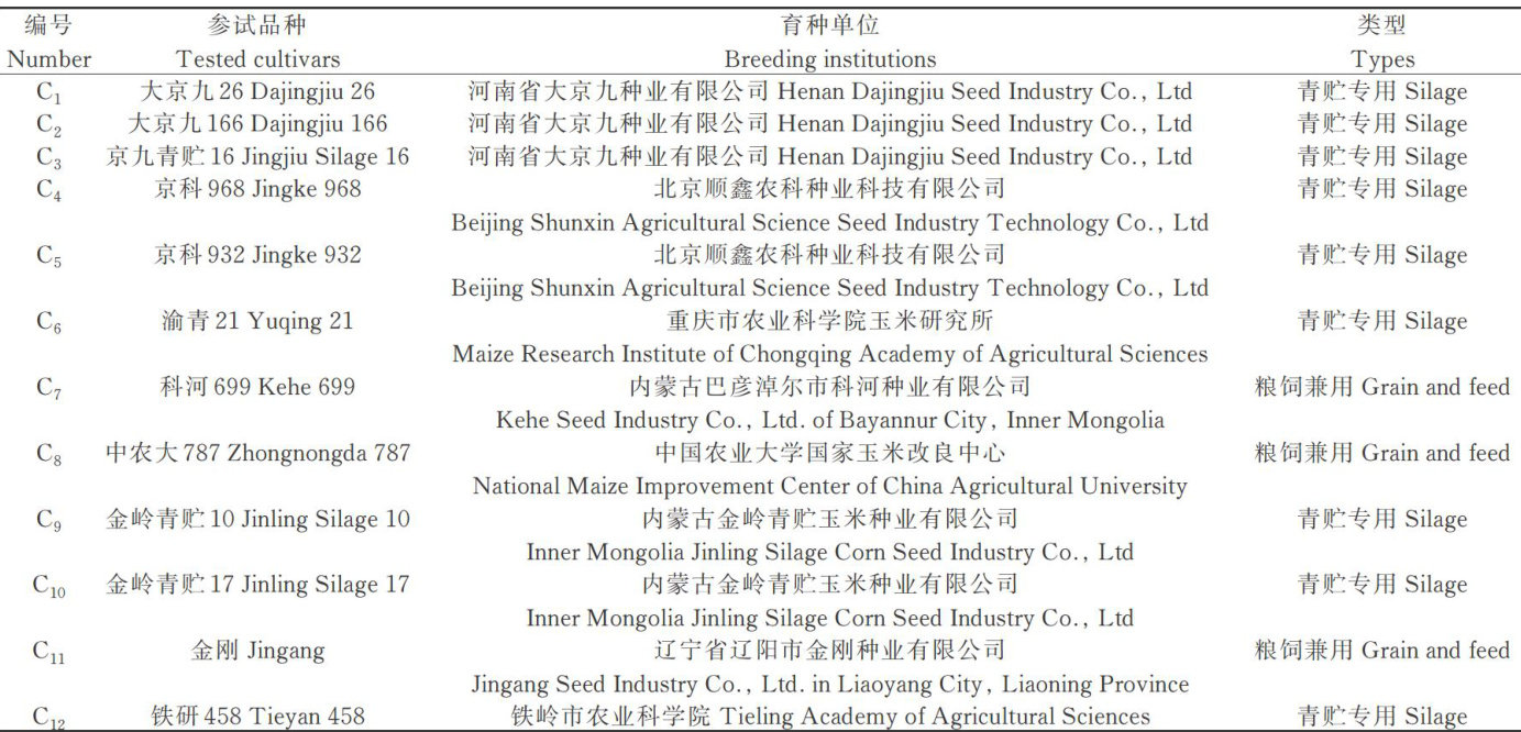 摘要:针对农牧交错带青贮玉米(Zeamays)品种适应性差、产量与品质协同优化机制不清楚,适宜榆阳风沙草滩区种植的青贮玉米品种数量少等问题。本研究以12个青贮专用型和粮饲兼用型玉米新品种为研究对象,通过双因素试验设计(2个密度梯度 ×12 个品种),结合灰色关联分析法对11项农艺性状、产量性状及营养品质指标进行综合解析。结果表明:品种对主要农艺性状、生物产量和营养品质等指标影响均较显著,密度仅影响株高、茎粗等农艺性状,而株高、茎粗、绿叶数和鲜重等指标受品种与密度交互效应影响。京九青贮16'和‘京科932’鲜草产量较高,分别达57.96和 57.91t?hm-2 ;‘京科 932°(8.25×104 株 ?hm-2) 与‘科河 S99′(6.75×104 株 ?hm-2) 综合排名表现优异,适宜在榆阳风沙草滩区进行示范和推广种植。对于降低畜牧业养殖成本,发展规模化养殖,促进农业产业结构调整等都具有重要意义。