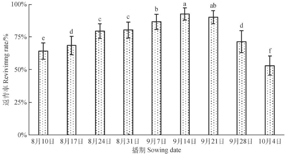 摘要:为探究科尔沁沙地冬黑麦(SecalecerealeL.)的适宜播期,以‘白BK-1'为试验材料,2023年8月10日至10月4日,每7天播种一次,共9个播期,探究播期对冬黑麦返青率和生产性能的影响。研究表明:随着播期的延后,各指标均呈先升高后降低的变化趋势。在9月14日及9月21日播种,冬黑麦返青率达到 90% ,在9月14日播种冬黑麦返青率最高达到91. 53% ;在9月14日及9月21日播种成熟期干草产量达到 20.00t?hm-2 ,干草产量和株高最大值均出现在9月14日播下,其值分别为 20.41t?hm-2 和 170.11cm ;冬黑麦各生育时期粗蛋白含量表现为拔节期 > 抽穗期 > 成熟期,3个生育时期相应的最大值分别出现在9月7日、9月14日和9月14日播期下;在9月14日播期下,冬黑麦拔节期、抽穗期和成熟期的中性洗涤纤维和酸性洗涤纤维含量最低。综合考虑冬黑麦的饲草产量和品质,科尔沁沙地在9月14日—9月21日播种较为适宜。