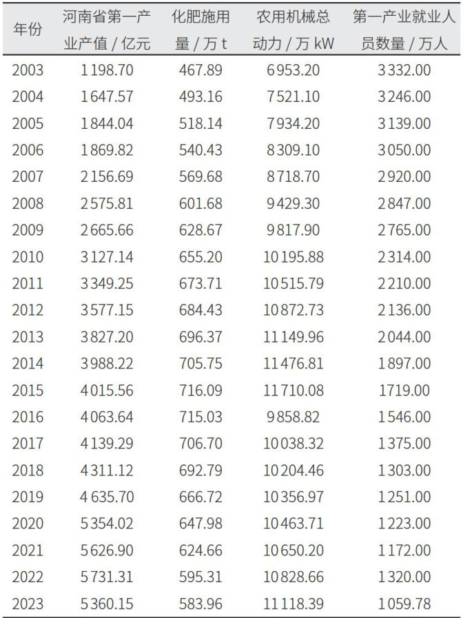 河南省作为农业大省,其第一产业产值在GDP构成中占据重要地位。第一产业是河南省经济发展的基础性产业,研究第一产业产值的影响因素对于制定农林牧副渔业相关政策、优化资源配置,进而促进其接续增长具有重要意义。选取2003一2023年河南省农业相关数据,构建多元线性回归模型,分析化肥施用量、农用机械总动力、第一产业就业人员数等因素对河南省第一产业产值的影响。结果表明,化肥施用量与第一产业就业人员数对河南省