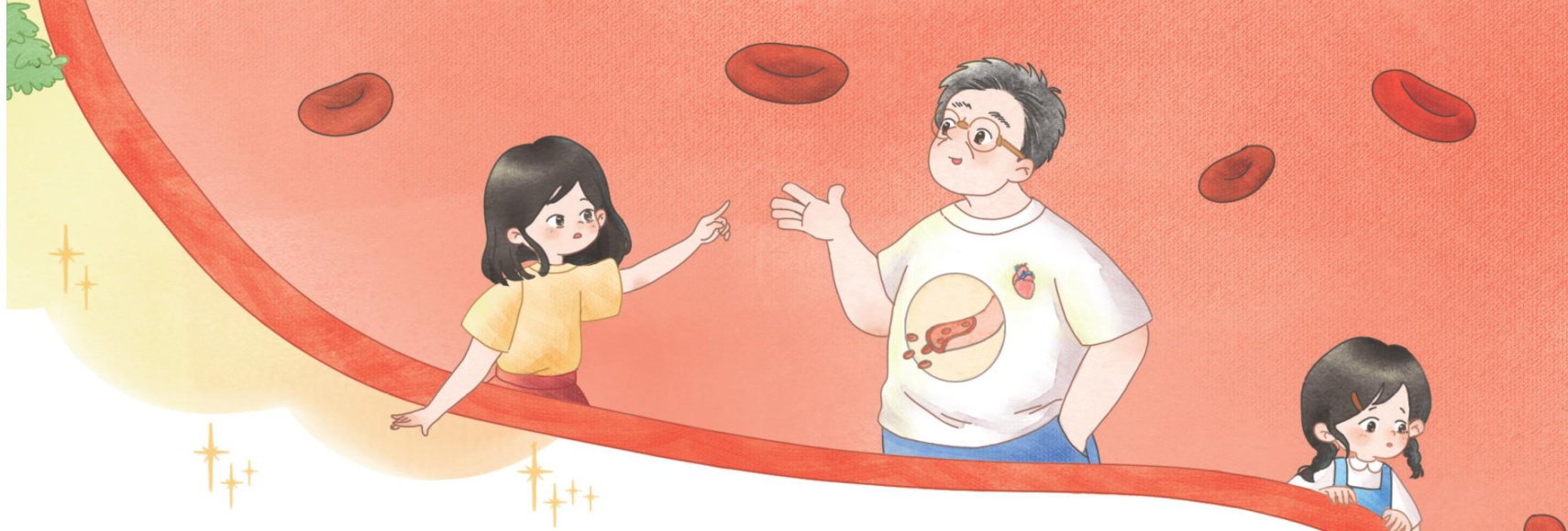 午后的“咚咚奇遇记 周日,午后的阳光把草坪晒得暖洋洋的,小冉蹲在树荫下,手里拿着一个秒表,正町着手腕上的脉搏数着:“72,73,74……笔记本上画着波浪线,旁边标注着“安静时心率”。 不远处,小文在跳绳,跳了没几下就捂着胸口蹲下来,脸颊红扑扑的:“呼…我的心在敲鼓!咚咚咚,像有人在里面打节拍!” 正说着,一阵自行车铃声传来,龙教授骑着一辆亮黄色的自行车停在院门口。他今天穿了件印着红色血管图案