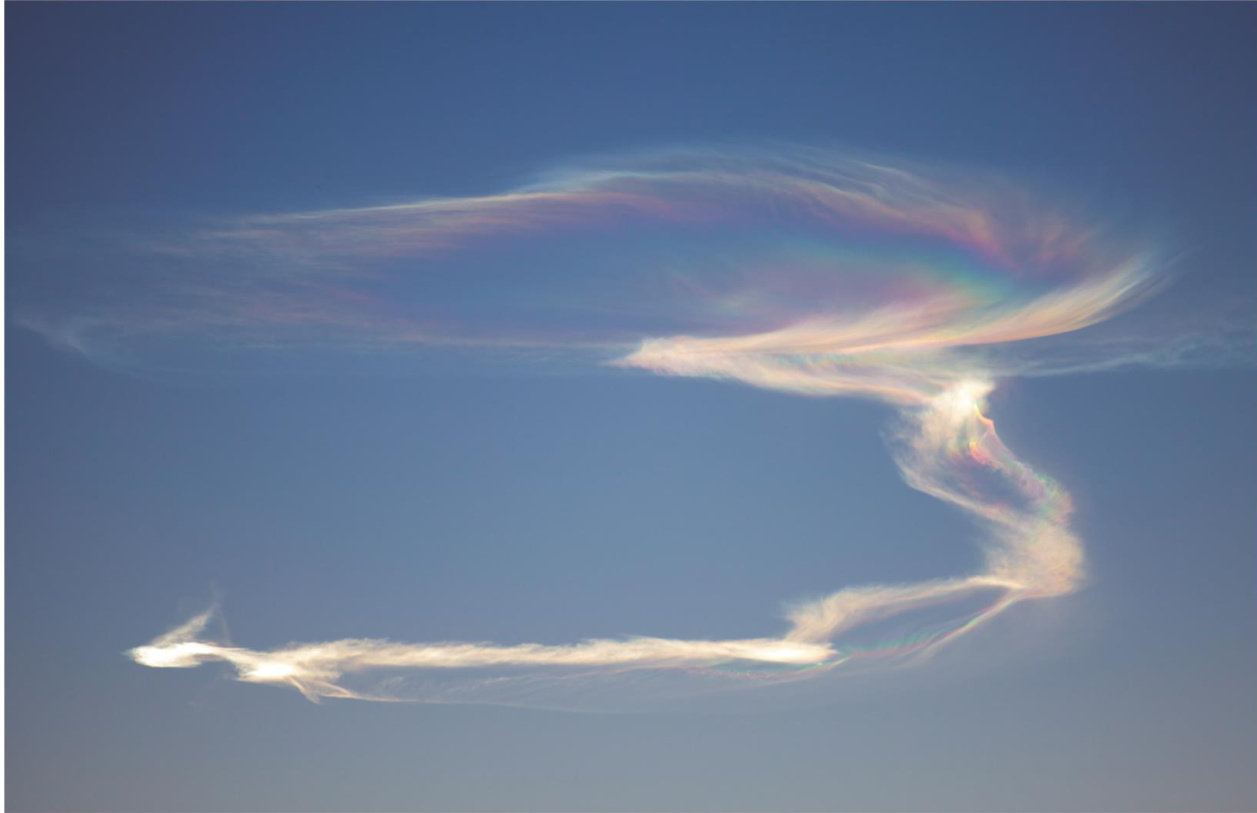 晴朗湛蓝的天空中,飘浮着一团流光溢彩的云,看上去如彩虹一般,与周围白色云朵形成鲜明对比。这种类似彩虹的云是怎么形成的?它的出现又预示着什么样的天气呢? 西湖上空现彩云 2019年8月8日,景区游人如织,热闹非凡。 这天天气晴朗,天空湛蓝,在火辣辣的阳光照射下,地面像着了火一般。尽管天气炎热,但游客仍旧兴致勃勃。13时许,天上的云渐渐多了起来,它们有的像羽毛,有的像鱼鳞,有的像棉絮…越来越多的