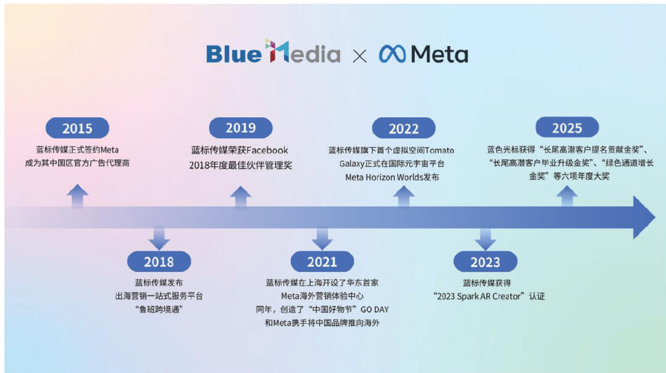 近日,旗下蓝标传媒成为Meta官方代理商十周年庆典活动在上海办公室成功举办。CEO潘飞、蓝标传媒高层以及Meta领导代表出席活动,回顾十年合作历程、分享丰硕成果,共同见证这一跨越里程碑、共拓新程的重要时刻。 共行十载,同心共频。故事的开始要追溯到2015年,时任移动互联CEO的潘飞(现任CEO)在飞机上偶然翻开《商业周刊》杂志的封面文章《Facebook生态圈里的中国面孔》,当时的他便坚信出
