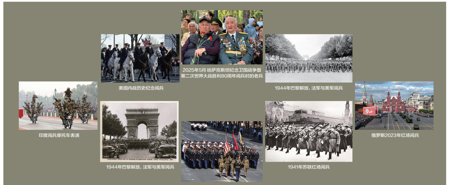 美法纪念一战结束100周年阅兵 2025年9月3日,中国在天安门广场组织了一场盛大、成功的大阅兵,以此表达对抗战历史和无数先烈的尊重,凝聚伟大民族精神,向世界传达中国维护公平正义的实力与决心。类似大阅兵,在中外历史上也发生过多次。埃及阿布辛贝神庙和卢克索神庙的军事浮雕,生动描绘了约公元前13世纪拉美西斯二世军事胜利和阅兵的场景。古罗马图拉真柱浮雕则生动再现了当时皇帝检阅罗马军团队列和装备的盛