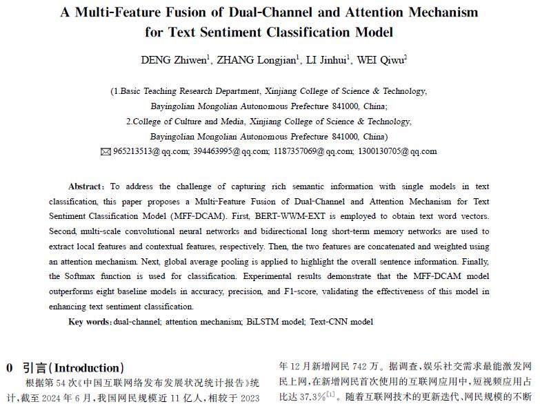 摘 要:针对单一模型在文本分类时难以捕捉丰富语义信息的问题,提出了一种基于双通道和注意力机制的多特征融合的文本情感分类模型(MFF-DCAM)。首先,利用BERT-WWM-EXT获取文本词向量;其次,分别使用多尺度卷积神经网络和双向长短期记忆网络提取局部特征和上下文特征;再次,拼接两个特征并使用注意力机制对该特征加权;然后,使用全局平均池化突出句子整体信息;最后,使用Softmax函数进行分类。实