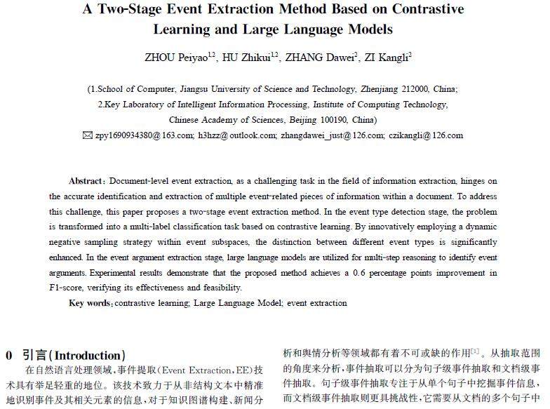 摘 要:文档级事件抽取作为信息抽取领域的一项颇具挑战性任务,其关键在于如何精确识别并抽取文档中蕴含的多个事件信息。针对这一难题,提出了一种双阶段事件抽取方法。在事件类型检测阶段,将问题转化为基于对比学习的多标签分类任务,并通过创新性的事件子空间的动态负例选择策略,有效增强了不同类型事件之间的区分度。在事件论元抽取阶段,利用大模型进行多阶段推理,完成事件论元的识别。实验结果表明,所提方法F1值提升了