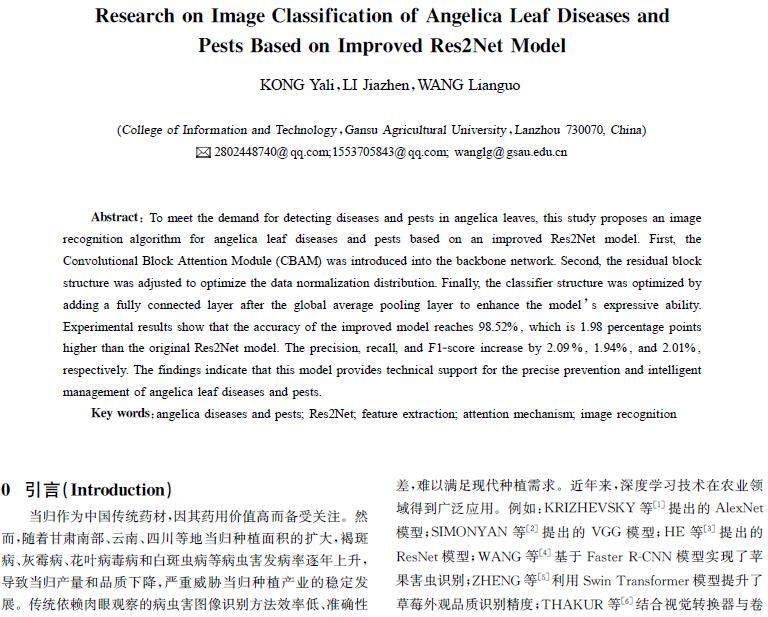 摘 要:为实现当归叶片病虫害检测需求,提出了一种基于改进Res2Net模型的当归叶片病虫害图像识别算法。首先,在骨干网络中引入CBAM(ConvolutionalBlockAttentionModule)卷积注意力机制;其次,调整残差块结构,优化数据归一化分布;最后,优化分类器结构,在全局平均池化层后增加全连接层,提高模型的表达能力。经验证:改进模型的准确率为98.52%,较原Res2Net模型提
