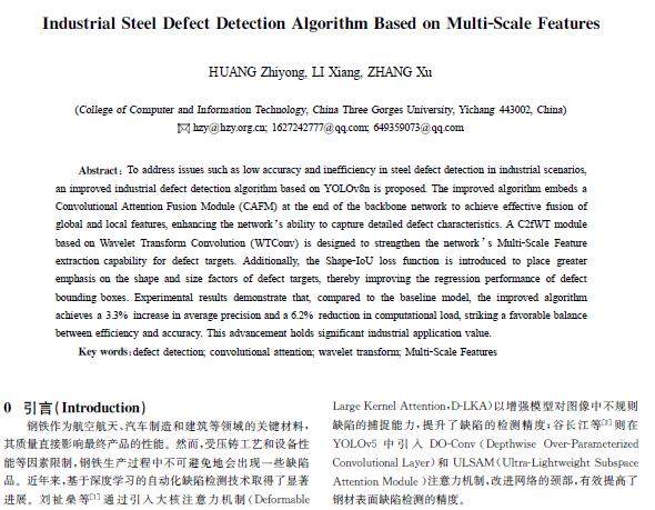 摘 要:针对工业场景中钢材缺陷检测精度以及检测效率都很低的问题,提出了一种基于YOLOv8n改进的工业缺陷检测算法。改进算法通过在主干网络末端嵌入卷积注意力融合模块(CAFM),实现全局与局部特征的有效融合,增强网络捕捉缺陷细节特征的能力。设计基于小波变换卷积(WTConv)的C2fWT模块,以增强网络对缺陷目标的多尺度特征提取能力。提出Shape-IoU损失函数以更加关注缺陷目标的形状与尺寸因素