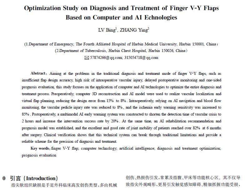 摘 要:针对手指V-Y皮瓣传统诊疗模式中皮瓣设计精度不足、术中血管损伤风险高、术后监测滞后及预后评估片面等问题,围绕计算机与AI技术的应用展开,旨在优化诊疗全流程。术前通过计算机三维重建与AI建模实现血管定位及皮瓣虚拟规划,将设计误差从15% 降至8%;术中依托AI导航与血流监测,使血管蒂损伤率降至8%,缺血预警灵敏度提升至85%;术后构建多模态AI预警体系,缩短血管危象发现时间至2h,干预成功率