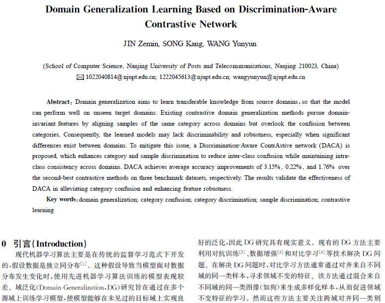 摘 要:领域泛化旨在通过从源域学习可迁移的知识,在源域上训练后,再推广到未见过的目标领域也能良好运行。现有的对比领域泛化方法通过跨领域对齐同一类别的样本来追求领域不变特征,但忽略了类别之间的混淆。因此,学习到的模型可能缺乏区分性和鲁棒性,尤其是在领域之间存在显著差异时。为此提出了判别感知对比网络(DACA),通过增强类别和样本的区分性减少类别之间的混淆,同时保持跨领域的类内一致性。DACA在3个基