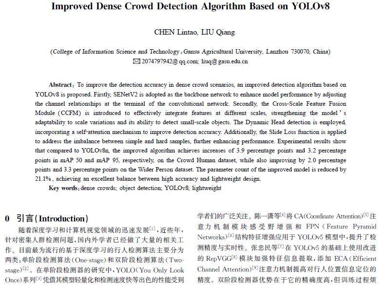 摘 要:为了在密集人群场景下提高检测精度,提出了一种基于YOLOv8改进的检测算法。首先,采用SENetV2作为主干网络,通过调整卷积网络的终端通道关系,以提升模型性能;其次,引入跨尺度特征融合模块CCFM(Cross-ScaleFeatureFusionModule),将不同尺度的特征进行有效融合,增强模型对尺度变化的适应能力及对小尺度对象的检测能力。使用DynamicHead检测头,增加自注意