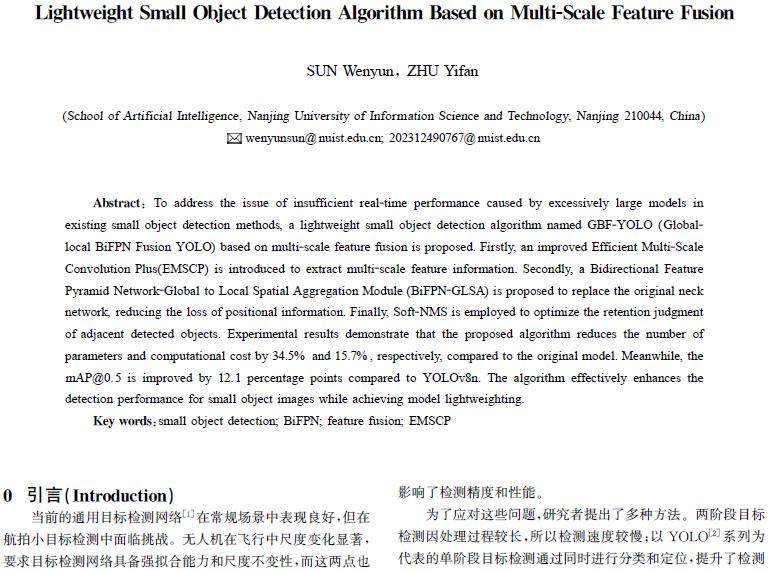 摘 要:针对现有小目标检测中的模型过大导致实时工作能力不足的问题,提出一种基于多尺度特征结合的轻量化小目标检测算法GBF-YOLO(Global-localBiFPNFusionYOLO)。首先,引入改进高效多尺度卷积模块(EfficientMulti-ScaleConvolutionPlus,EMSCP),提取多尺度特征信息;其次,提出双向特征金字塔网络BiFPNGLSA并替换原颈部网络,减少位