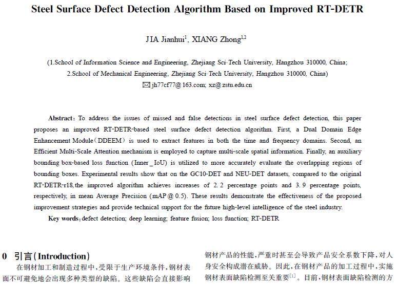 摘 要:为解决钢材表面缺陷检测中漏检和误检问题,提出一种改进RT-DETR的钢材表面缺陷检测算法。首先,使用双域边缘增强模块DDEEM(DualDomainEdgeEnhancementModule)在时域和频域提取特征;其次,采用高效多尺度注意力机制(EfficientMulti-ScaleAttention)捕捉多尺度空间信息;最后,使用基于辅助边框的损失函数(Inner_IoU)更准确地评估