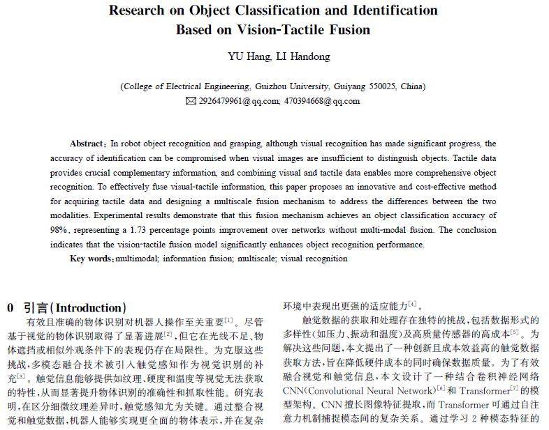 摘 要:在机器人识别并抓取物体中,视觉识别虽取得显著进展,但在视觉图像不足以区分物体时,识别准确率会受到影响。触觉数据能提供重要的互补信息,结合视觉与触觉数据能实现更全面的物体识别。为了有效融合视、触觉信息,提出了一种创新且经济的方法获取触觉数据,设计了多尺度融合机制以应对两种模态的差异。实验结果表明,该融合机制使物体分类准确率达到98%,较未融合网络提升1.73个百分点。结论表明视触融合模型可显