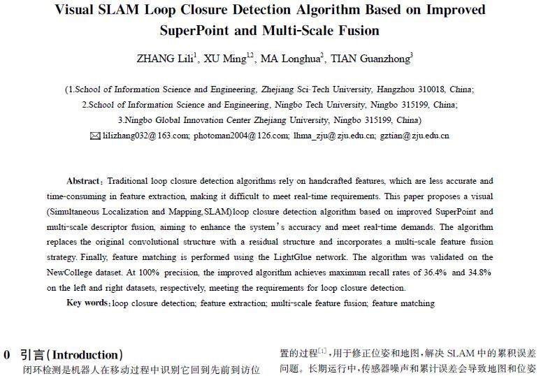 摘 要:传统闭环检测算法采用人工设计特征,准确性差且特征提取耗时,难以满足实时性需求。因此,提出了一种基于改进SuperPoint与多尺度描述符融合的视觉同时定位与建图SLAM(SimultaneousLocalizationAndMapping)闭环检测算法,旨在提高系统的准确性并满足实时性需求。该算法引入残差结构替代原卷积结构,同时融合了多尺度特征融合策略,最后通过LightGlue网络进行特