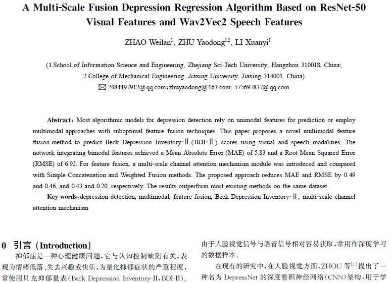 摘 要:很多抑郁症检测算法都是基于单模态特征来预测抑郁症,或使用了多模态方法,但特征融合方法有待优化。因此,提出一种新的多模态特征融合方法,从视觉模态和语音模态预测贝克抑郁量表(BDI-Ⅱ)得分,双模态融合后的网络平均绝对误差(MAE)和均方根误差(RMSE)分别为5.83和6.92。在特征融合方面,引入多尺度通道注意力机制模块与特征简单拼接(SimpleConcatenation)和加权融合(W