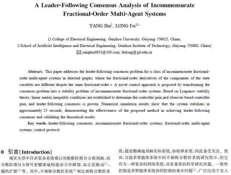 摘 要:针对分数阶导数α 相同,但状态变量的分量对应的分数阶导数αi,i∈{1,2,…,n}不同的一类不相称分数阶多智能体系统在有向图中的领导跟随一致性问题,提出了一种新的控制方法,通过将一致性问题转化为不相称分数阶系统的稳定性问题。基于李雅普诺夫稳定性理论,提出了线性矩阵不等式条件来确定控制器增益与基于观测器的控制器增益,并证明了新方法的领导跟随一致性。由数值仿真结果可知,仿真系统仅需约25s即