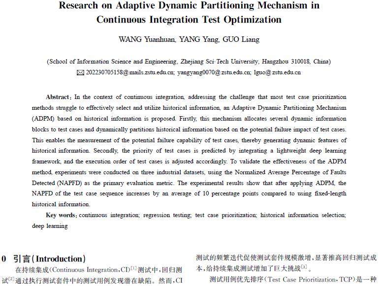 摘 要:在持续集成环境下,针对大多数测试用例的优先排序方法难以有效选择和利用历史信息的问题,提出了一种基于历史信息的自适应动态划分机制(ADPM)。首先,该机制为测试用例分配若干动态信息块,并根据测试用例潜在失效影响动态划分历史信息,实现测试用例潜在失效能力的度量,并以此生成历史信息动态特征;其次,结合轻量级深度学习框架预测测试用例优先级,调整测试用例执行顺序。为验证ADPM 方法的有效性,在3个