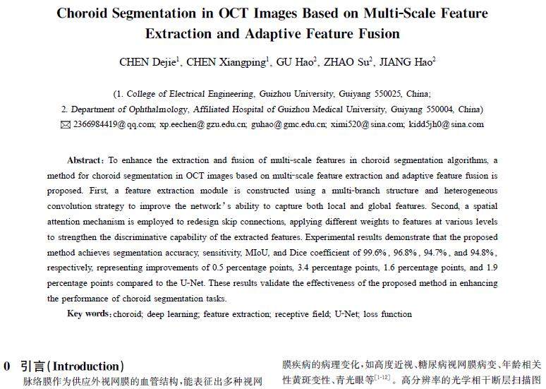 摘 要:为提高脉络膜分割算法对多尺度特征的提取和特征融合问题,提出了一种基于多尺度特征提取和自适应特征融合的OCT图像脉络膜分割方法。首先,通过多分支结构和异构卷积策略构建特征提取模块,提高网络对局部特征和全局特征的提取能力;其次,采用空间注意力机制重构跳跃连接,将不同的权重应用于不同级别的特征,强化对提取特征的区分能力。实验结果表明,所提方法在分割精度、灵敏度、MIoU和Dice系数分别达到了9