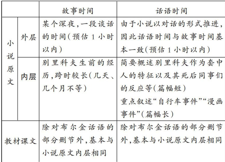 摘要:《装在套子里的人》具有叠套叙事的特点,在叙事交流、叙事时间、叙事空间、人物话语等方面呈现出独特的审美意蕴。新教材收录该文时沿用旧教材的删改原则,也造成了一些主要问题:其一,叙事交流层的剥离割裂;其二,叙事时间层的参差异变;其三,叙事空间层的隐匿消蚀;其四,人物话语层的审美转向。在一线教学中,教师可以引入叙事学理论,通过原文与课文互涉的方式,体悟契诃夫的叙事匠心,留住文本的“原汁原味”。