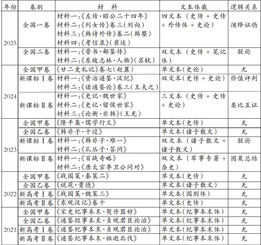 摘要:本文通过对2021-2025年全国32套高考卷文言文试题进行统计与分析,总结出选材组织趋向多元、题型设计凸显开放、考查内容聚焦思辨的命题趋势。基于此,提出素养导向的文言文教学路径:强化文本联结,培养综合意识;创设具体情境,实现迁移运用;发展批判思维,涵养学科素养。