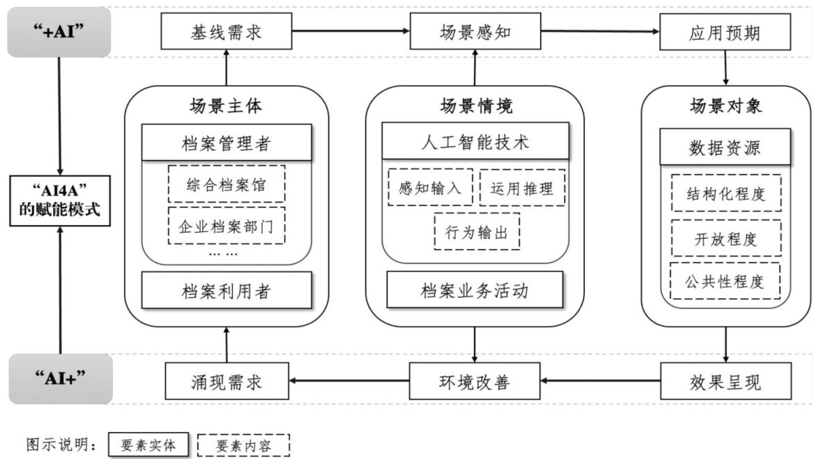 摘要:人工智能的发展正由技术突破走向应用融合,场景作为其应用的重要承载,已成为研究档案业务智能化转型的关键切口。场景的内涵可从物理空间、信息系统、行为选择与上下文四个方面加以理解,在人工智能赋能档案业务的视角下,呈现出场景主体、情境和对象的基本要素结构,并通过需求响应和需求创造的动态作用过程,分化为“ + AI"和"AI + ”两类AI赋能模式。总体来看,场景为人工智能在档案业务中的应用提供了整合性的框架,在协调技术能力与业务需求的同时,通过动态演化不断推动应用创新。
