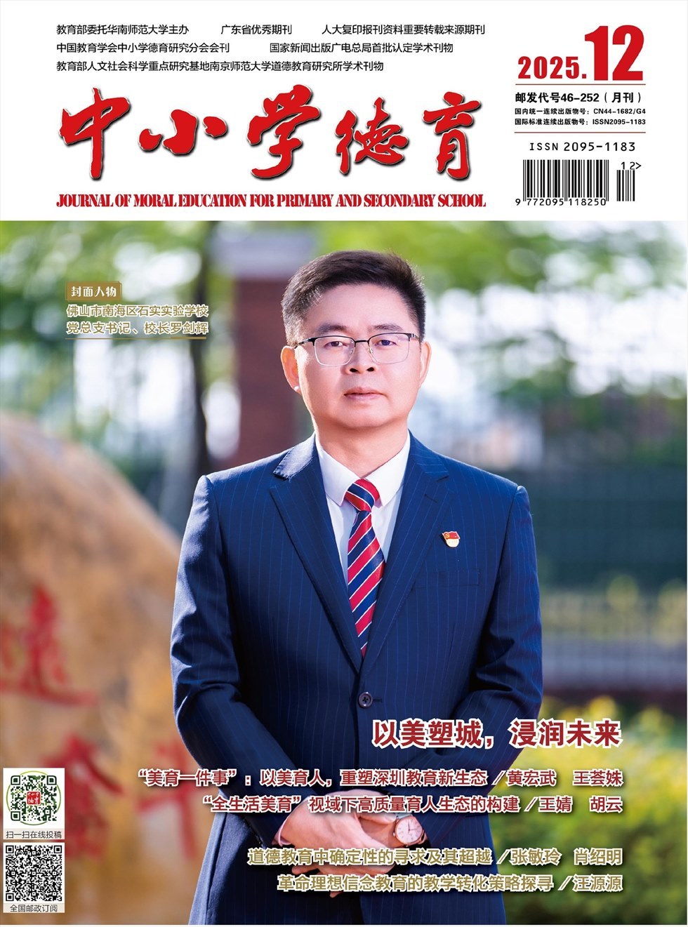 《中小学德育》是由国家教育部委托华南师范大学主办的一本全面反映中小学德育工作的专业期刊,同时作为中国教育学会中小学德育研究分会会刊。本刊致力于为中小学德育理论研究与实践工作者提供最新的德育改革动向、权威的德育政策指引、新锐的德育研究成果、鲜活的德育实践经验,力争成为中小学德育改革的“风向标”,锐意改革的“排头兵”,德育工作者交流经验、探索德育规律的“大舞台”,引领德育行政部门、教研部门和广大德育教师的“参谋部”。