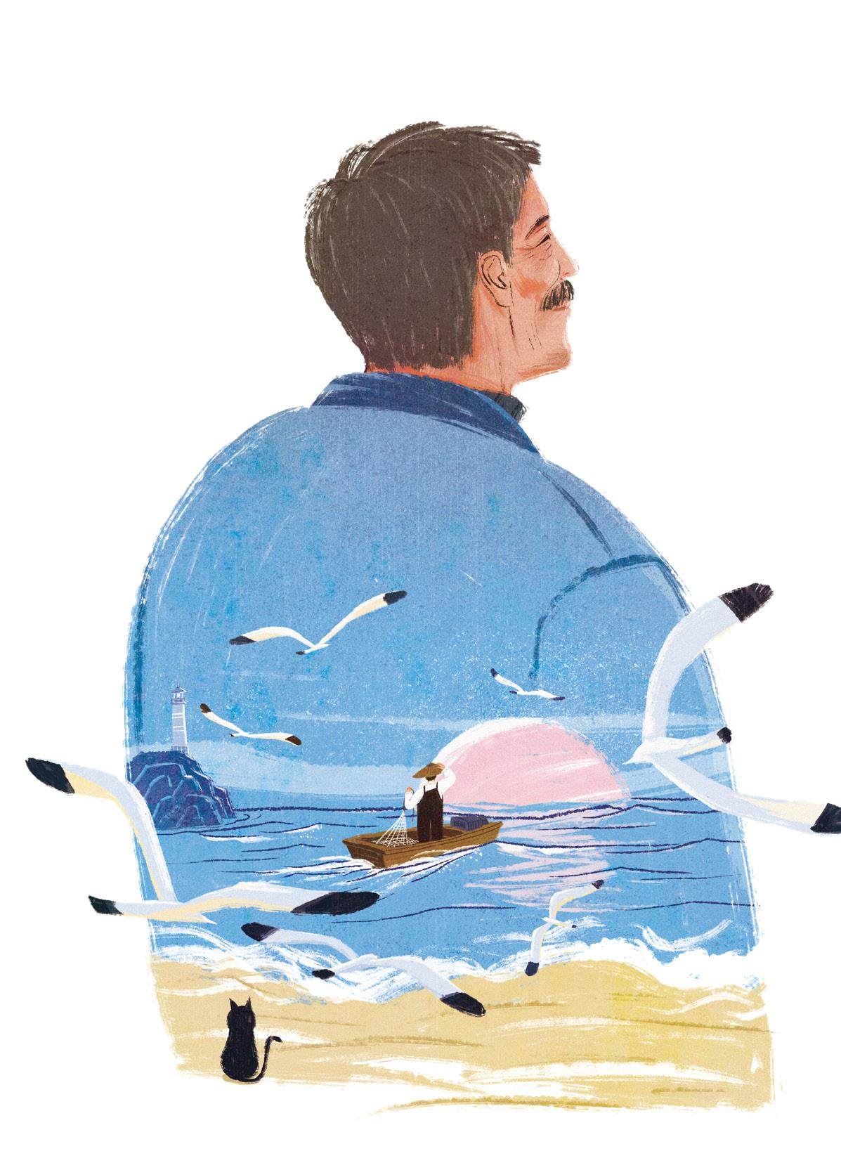 只要不封海,我家前屋的老大就会驾船出海。他打上来的黄花鱼一包子儿,芬芳了整个渔村。人说,海鱼不腥吗?非也,刚捕上来的新鲜海鱼,有一股特殊的芳香。喜欢吃鱼的人见了,就像猫见了腥,挪不动腿。夏天,我家的猫总喜欢在我家屋檐下的木梁上睡觉,因为奶奶总是把晒鱼的篮子挂在木梁上。猫盗一点儿鱼去,奶奶从不嗔怪。 老大是全村的“老大”,连奶奶都这样叫他呢。老大长得有些矮,在庄稼地里干活不行,算半个劳力,每天仅挣