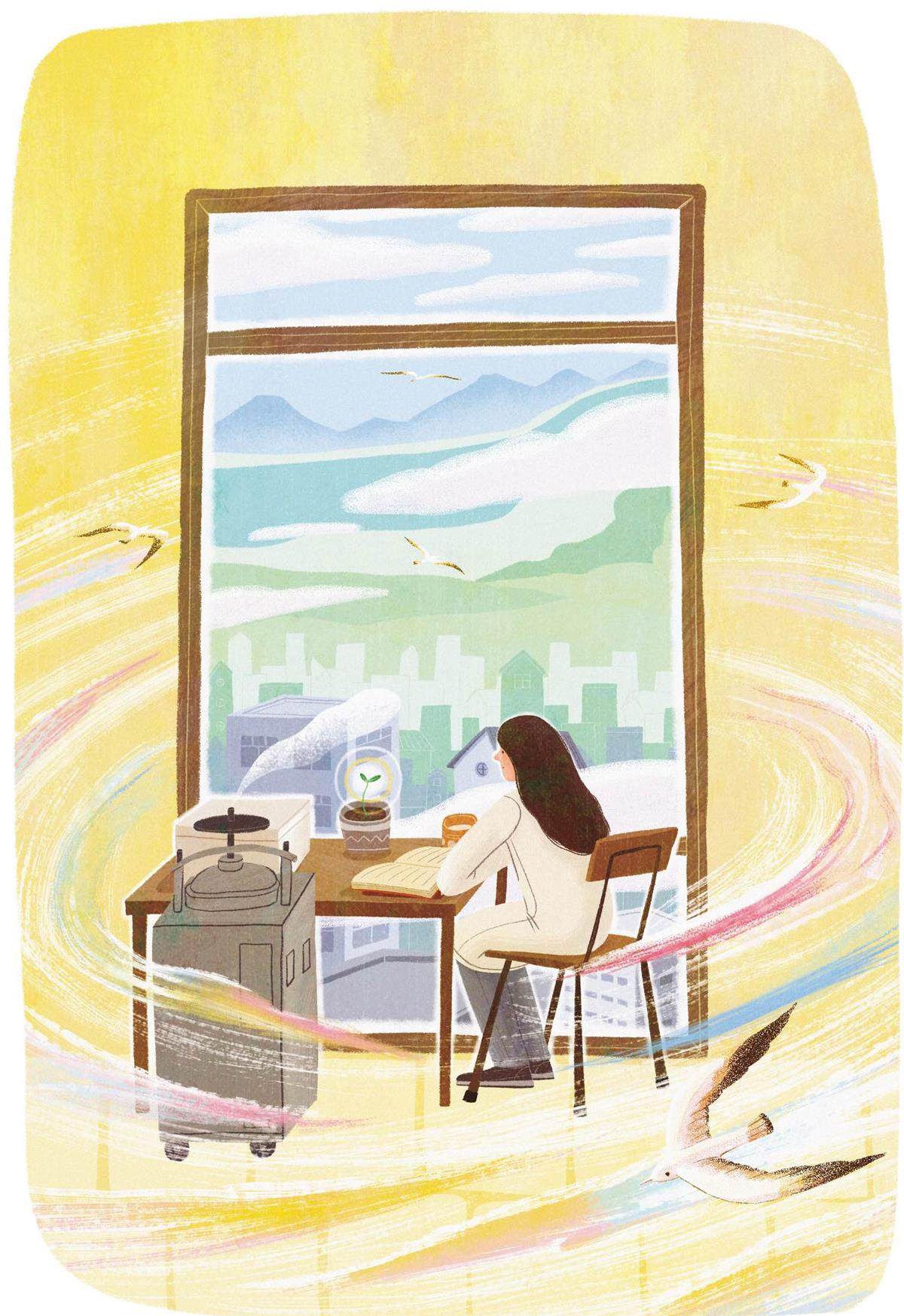 一 4月的杭州,阳光泛滥,气温骤升,还没来得及回味落花荡漾在西湖柔波的縷縟温柔,就要褪去春装了。下午,坐在顶楼的落地窗前,阳光照进来,尽情铺洒到每个角落,白色地砖和金属门把手反射出阵阵涟漪,深浅不一的光线汇聚在一起,空间凝固了,世界变成一块剔透的水晶,万物都是光的映象。光影流转,成团的白云从窗边流走,在半空中缓缓变幻形状。公司外墙上的红色蔷薇、隔壁瓜子厂天台上晾晒的坛坛罐罐,甚至远处的钱塘江,全