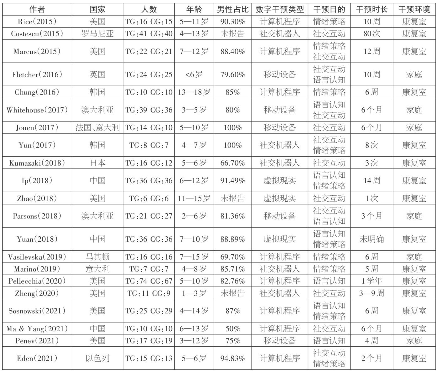 【摘要】孤独症谱系障碍是神经发育障碍性疾病之一,其干预手段主要依靠教育和干预训练。随着现代科技的发展,基于数字技术的干预受到越来越多研究人员的关注。为进一步探究数字技术辅助的干预对孤独症儿童社交技能的影响,采用元分析方法对30项数字干预的实验和准实验研究进行系统定量分析。研究发现,随机效应模型显示合并效应值为0.434,且达到统计显著水平,说明相较于传统干预手段,基于数字技术的干预对孤独症儿童社交技能提升具有中等程度的积极影响;数字技术应用于社交互动和情感策略方面的干预效果更为显著;基于虚拟现实技术和社交机器人技术的干预对孤独症儿童社交技能提升的有效性最为显著;基于数字技术的干预对不同年龄组间的干预效果差异没有达到统计学上的显著性;干预时间小于一个月呈现出最强的干预效果;干预环境(康复室和家庭)对孤独症儿童社交技能提升的效果没有显著差异。