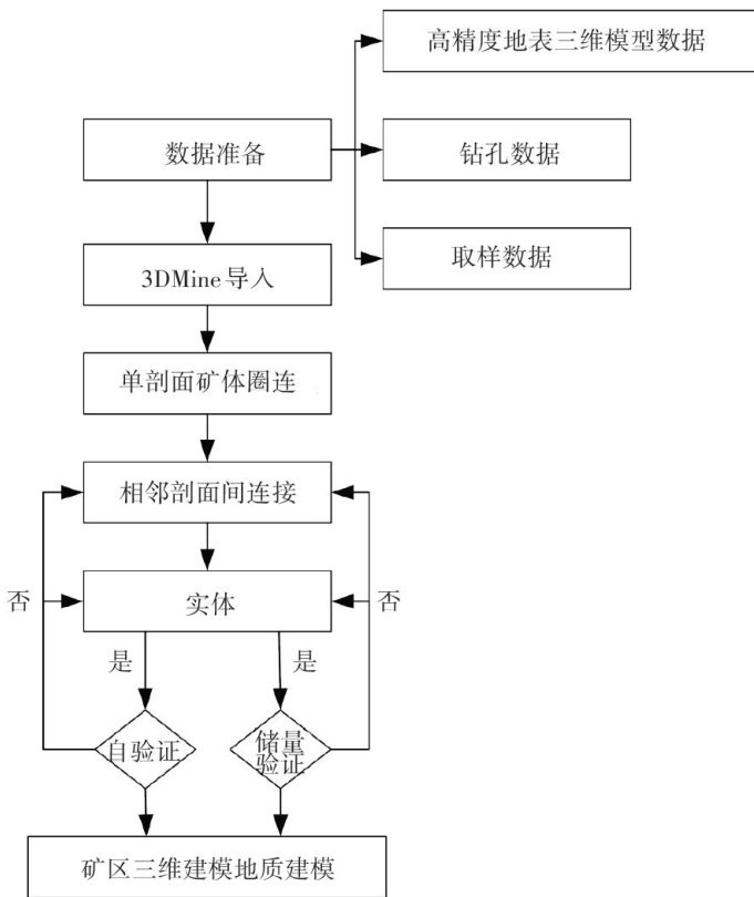 摘要:【目的】三维地质建模技术通过集成多源地质数据,可精准表征地下矿产资源的空间分布特征。但目前进行矿山三维建模时对模型可靠性验证研究较少,本研究系统梳理三维地质建模技术研究进展,并以某矿山详查项目为研究对象,整合多源数据,构建精细化三维矿体模型并进行模型验证,旨在提高模型精度,为矿山后期开采提供数据支撑。【方法】研究方法主要为: ① 基于国产3DMine软件平台建立标准化地质数据库,通过相邻勘探剖面拓扑连接构建矿体实体模型; ② 采用传统块段法对模型进行交叉验证,评估其储量计算可靠性; ③ 耦合边坡台阶参数化设计模块,生成可开采资源量动态评价模型。【结果】结果表明:3DMine软件构建的矿体模型资源储量估算值为913.73万 m3 ,与传统块段法计算结果偏差为9.71万 m3 ,相对误差 1.1% ,符合《固体矿产资源储量估算规范》允许误差范围;经开采边坡约束优化后,可采矿产资源量达481.55万 m3 ,有效提升了矿体经济可采性评价精度。【结论】本研究验证了国产三维矿业软件在复杂矿体建模中的适用性,为数字化矿山建设提供了技术参考。